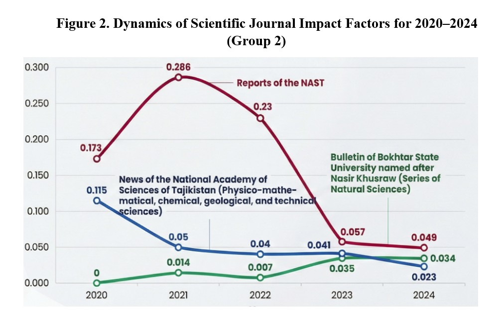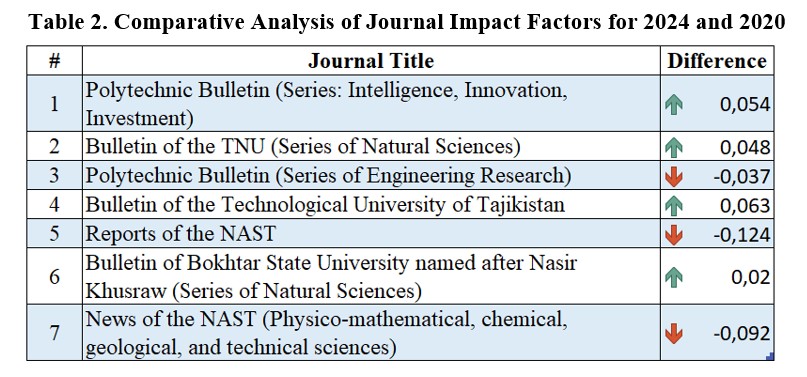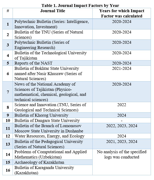 Currently, the list of peer-reviewed journals of the Higher Attestation Commission under the President of the Republic of Tajikistan includes 67 scientific journals. Among them, 16 (23.9%) belong to the field of natural-mathematical and technical sciences, three of which are foreign journals. Based on this, it was decided to conduct a comprehensive analysis of the impact factor values of Tajikistan's peer-reviewed journals in the natural, mathematical, and technical sectors. The analysis of scientific journals' impact factors is a key indicator for evaluating the effectiveness of their performance.