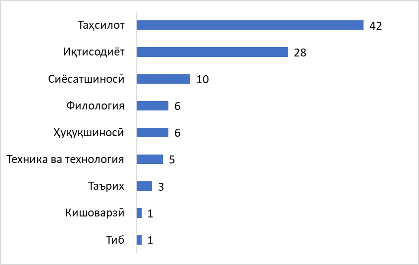 Илова бар ин, вобаста ба самтҳои илмӣ муайян гардид, ки аз ҳама бештар чунин корҳо ба самти илмҳои таҳсилот, иқтисодиёт ва сиёсатшиносӣ рост меоянд.