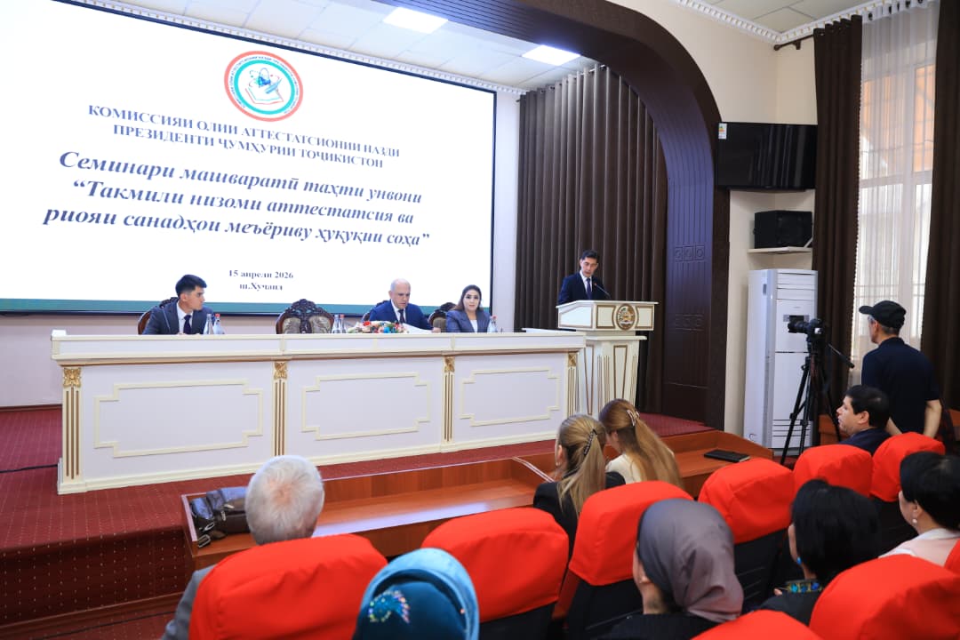 Дар толори Муассисаи давлатии таълимии «Донишгоҳи давлатии Хуҷанд ба номи академик Бобоҷон Ғафуров» имрӯз бо иқдоми Комиссияи олии аттестатсионии назди Президенти Ҷумҳурии Тоҷикистон семинари машваратӣ таҳти унвони «Такмили низоми аттестатсия ва риояи санадҳои меъёриву ҳуқуқии соҳа» баргузор гардид.