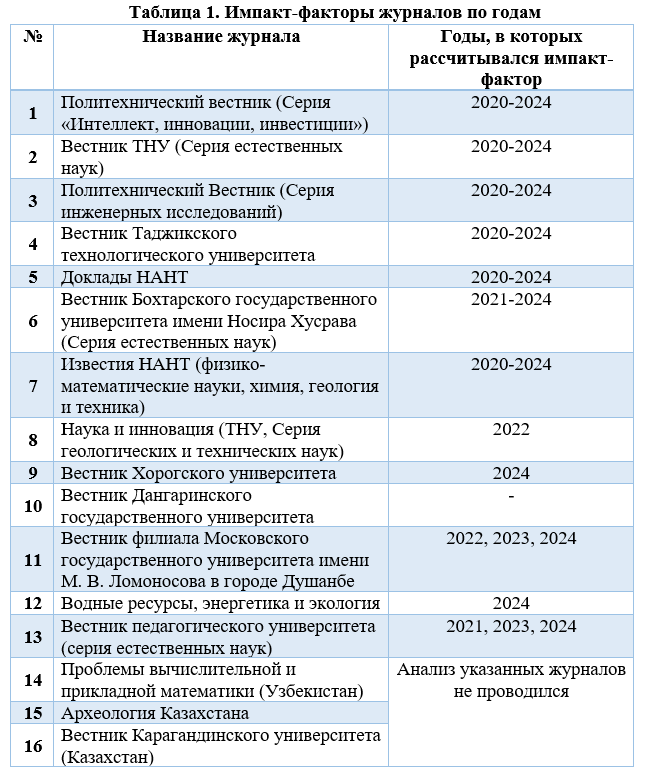 В настоящее время в перечень рецензируемых журналов Высшей аттестационной комиссии при Президенте Республики Таджикистан включены 67 научных журналов. Среди них 16 (23,9%) относятся к области естественно-математических и технических наук, три из которых являются иностранными журналами. Исходя из этого, было принято решение провести всесторонний анализ о значениях импакт-фактора рецензируемых журналов Таджикистана в естественно-математических и технических отраслях.